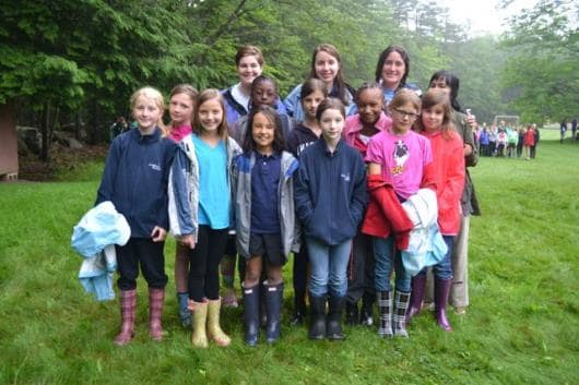 A group of children and adults stand outdoors on the grass, surrounded by trees in the background. Some children, participants of a campership program, are wearing rain boots and holding jackets.