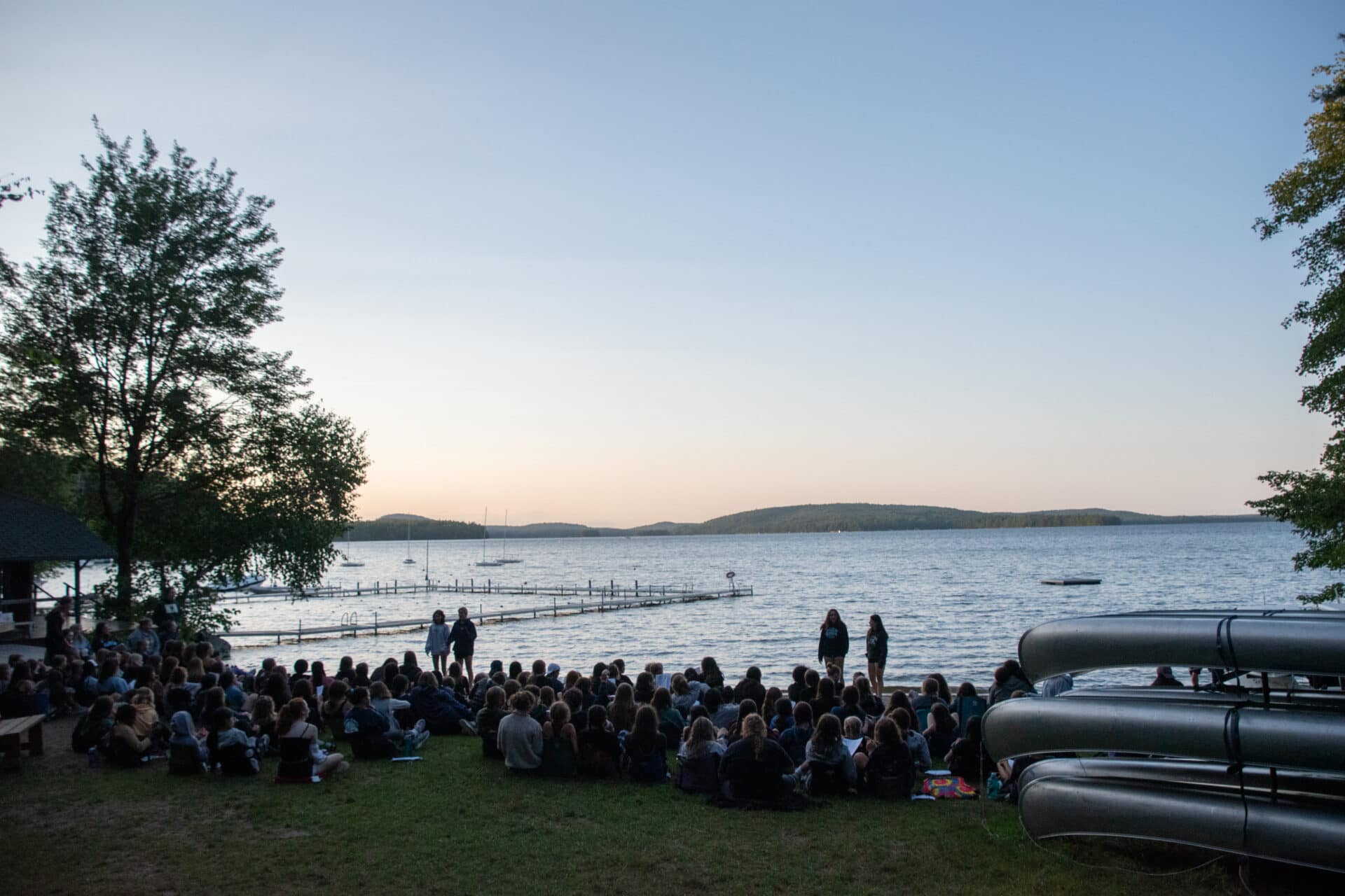 A large group of people sit facing a lake at sunset, sharing stories, with a dock and canoes visible. Trees frame the sides of the image.
