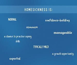 Each letter your camper sends is a snapshot in time and emotion – not just a snapshot, but one of a moment that happened days prior (which feels more like worlds away at camp) by the time that letter arrives in your mailbox. We also need to recognize that along that spectrum of daily emotions, among the good and even the neutral, there are also many which are tough feelings. Working through these emotions are a function and benefit of camp and communal living – not a fault nor error. And here’s the good thing: homesickness is normal and typically mild. In a study of 329 campers, Dr. Thurber reported that about 83% of campers reported feeling homesick on at least one day of camp.